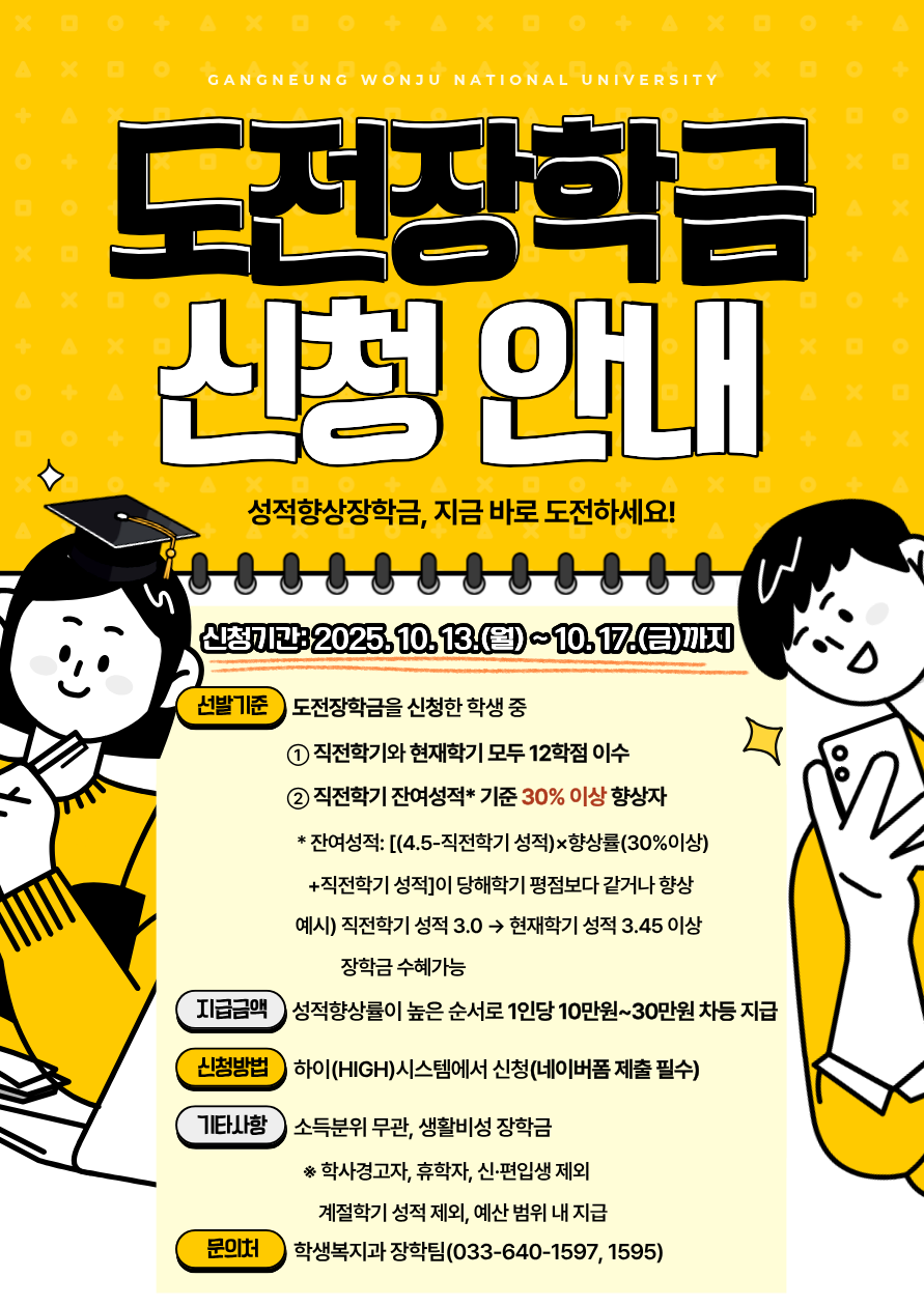 fnctId=bbs,fnctNo=877 2025학년도 2학기 도전장학금(성적향상장학금) 신청 안내 및 홍보 협조 요청 작성일 2025.10.01 작성자 정하나 조회수 215 첨부파일 첨부파일이(가) 없습니다.