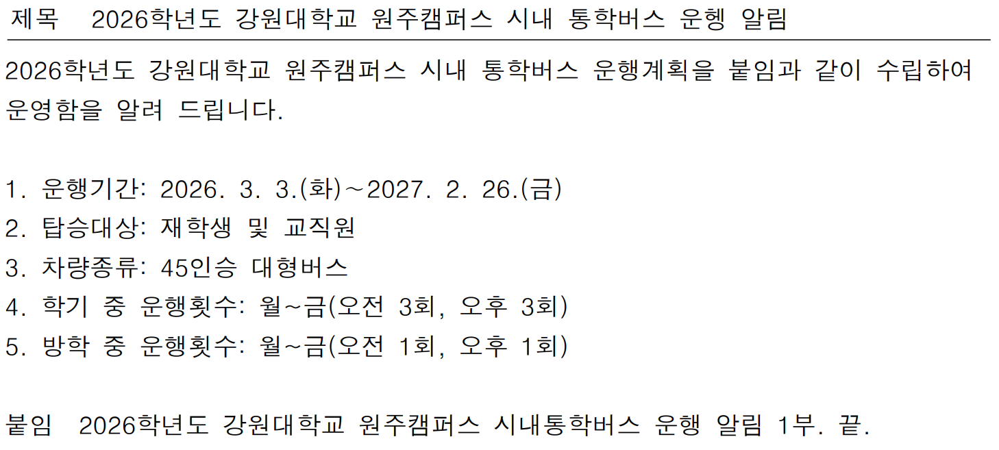 fnctId=bbs,fnctNo=877 2026학년도 강원대학교 원주캠퍼스 시내 통학버스 운행 알림 작성일 2026.03.04 작성자 정하나 조회수 394 첨부파일 ★(알림) 2026학년도 시내통학 운행알림2026. 3.-5-1.hwp